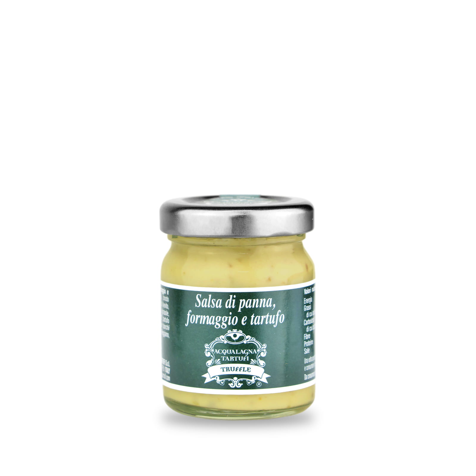 Składniki: ŚMIETANA 64,8%, bulion warzywny (woda, sól morska, ekstrakt drożdżowy, mąka ryżowa, cebula, olej słonecznikowy, czosnek), MASŁO, mąka PSZENNA typu „00”, trufla bianchetto (Tuber borchii Vitt. lub Tuber albidum Pico) 5%, SER Parmigiano Reggiano, sól, aromaty.